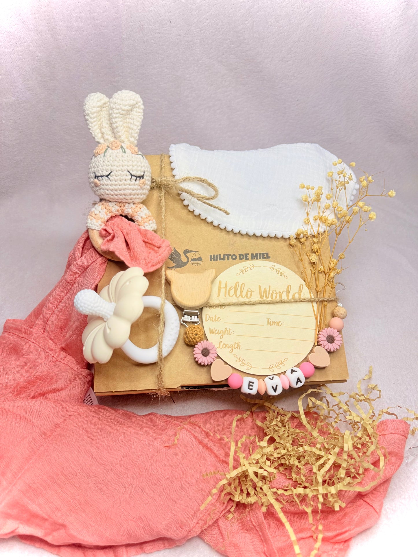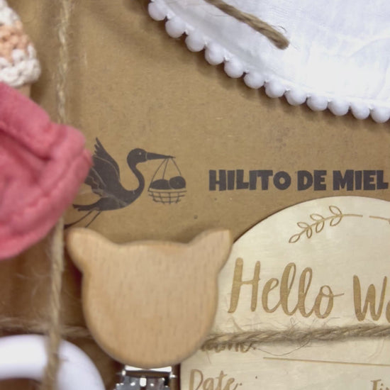 • Placa de madera "Hello world" donde podrá recopilar sus datos al nacer.