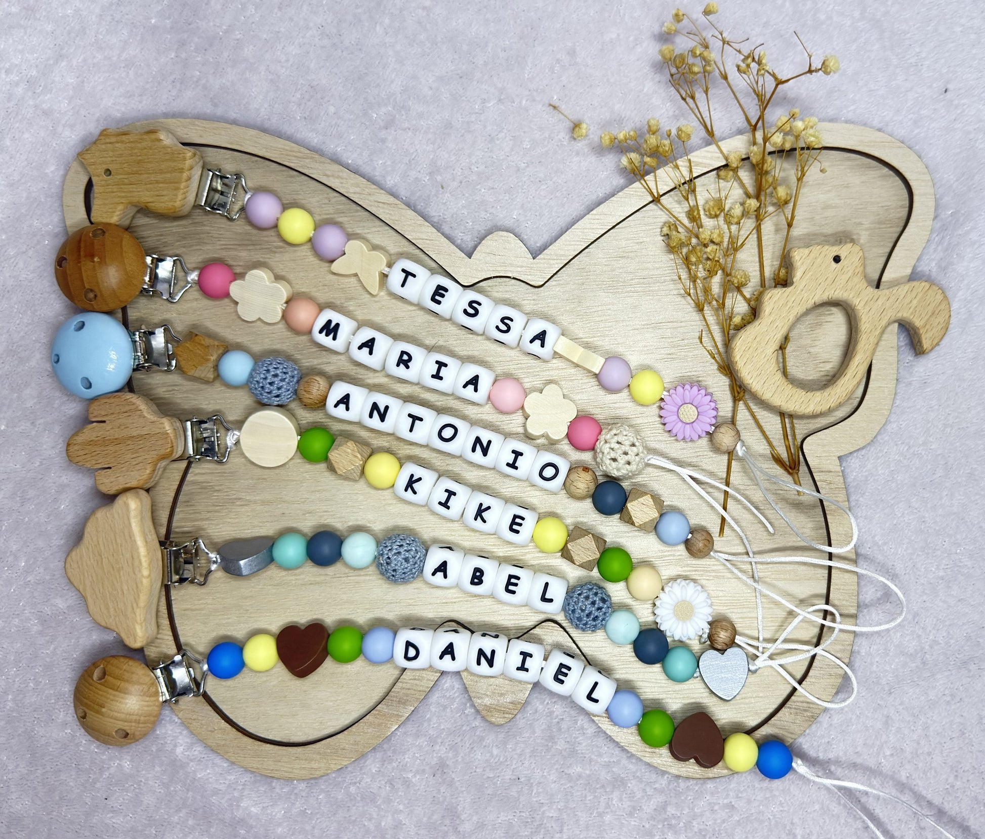 Su diseño ligero y flexible evita tirones incómodos y se sujeta fácilmente a la ropa mediante un clip seguro y antideslizante. Además, puedes personalizarlo con el nombre o inicial del bebé, convirtiéndolo en un detalle único y especial.